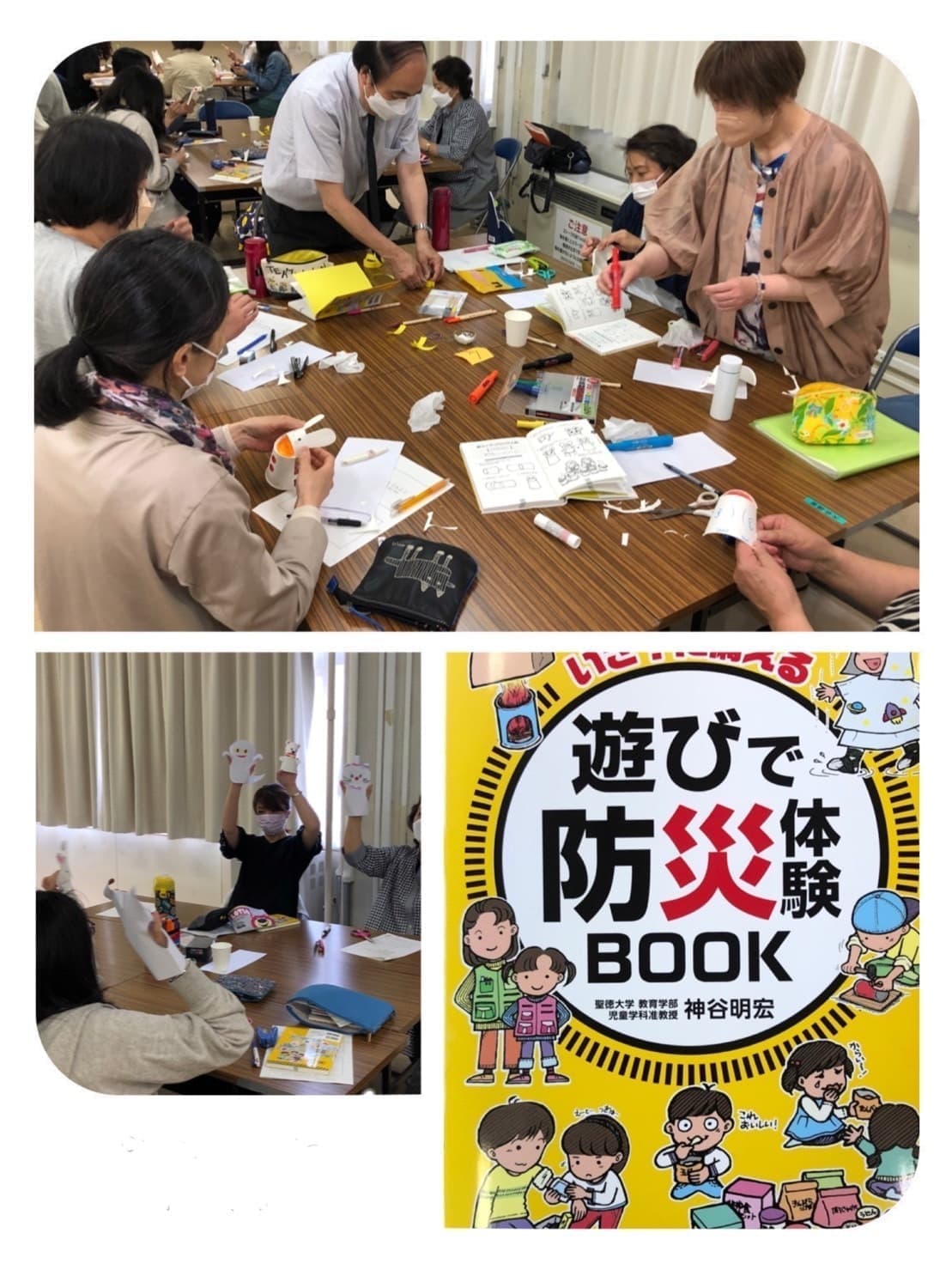 子育て支援職員として「いざ!に備えるために」の内容で、聖徳大学教育学部児童学科 神谷明宏准教授を講師に、『遊びで防災体験Book』をテキストとして、災害時の対応について学びました。