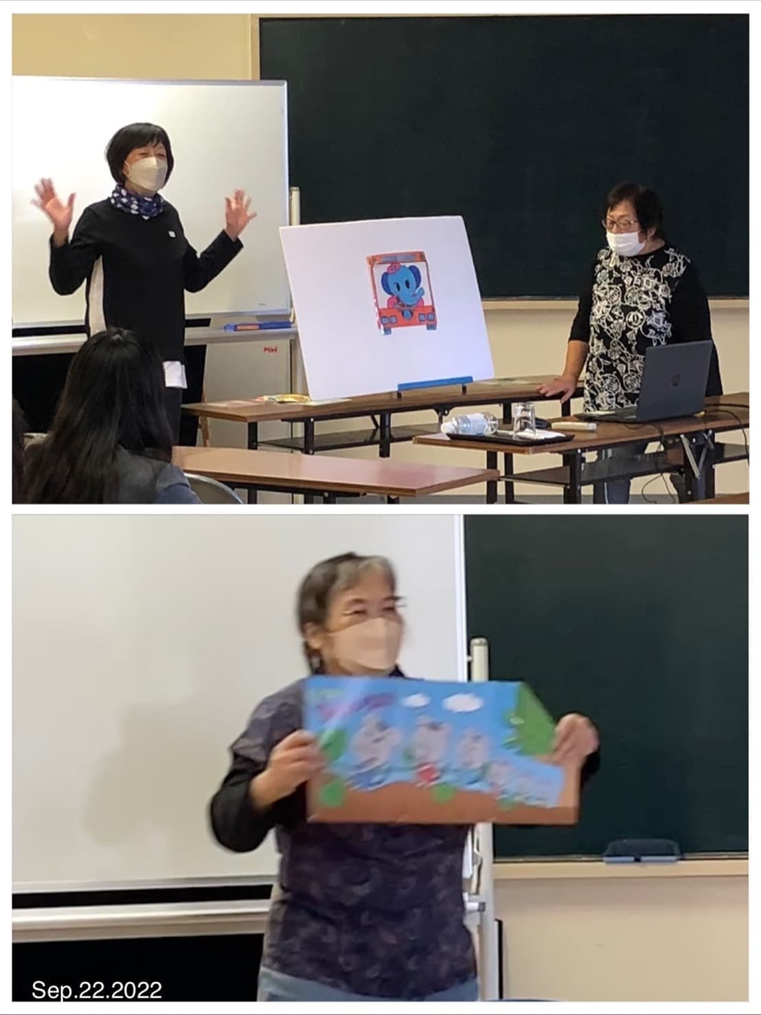 希望職員が発表したパネルシアター、カードシアターにわけちゃんが丁寧にアドバイス。適切な助言にみんな、モチベーションが上がり、最後のわけちゃん劇場も初お目見えの演目で時間オーバーになるほどでした。