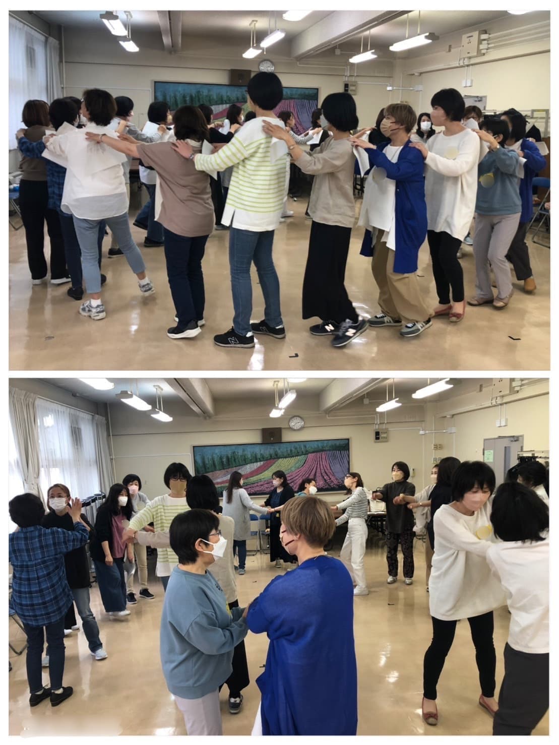 リトミックとは何かを資料を使い学んだ後、ペアになってピアノリズムに合わせて動き回りました。