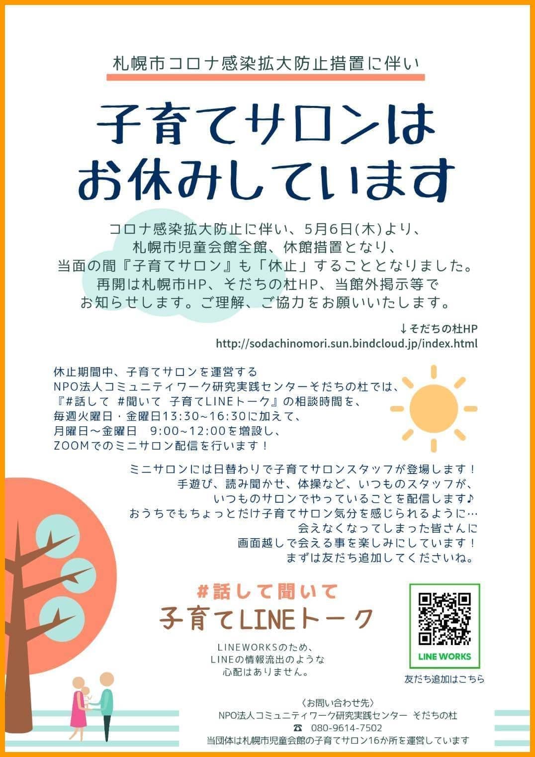 緊急事態宣言延長に伴い、札幌市内の児童会館およびそだちの杜で実施している子育てサロンは休止しています。