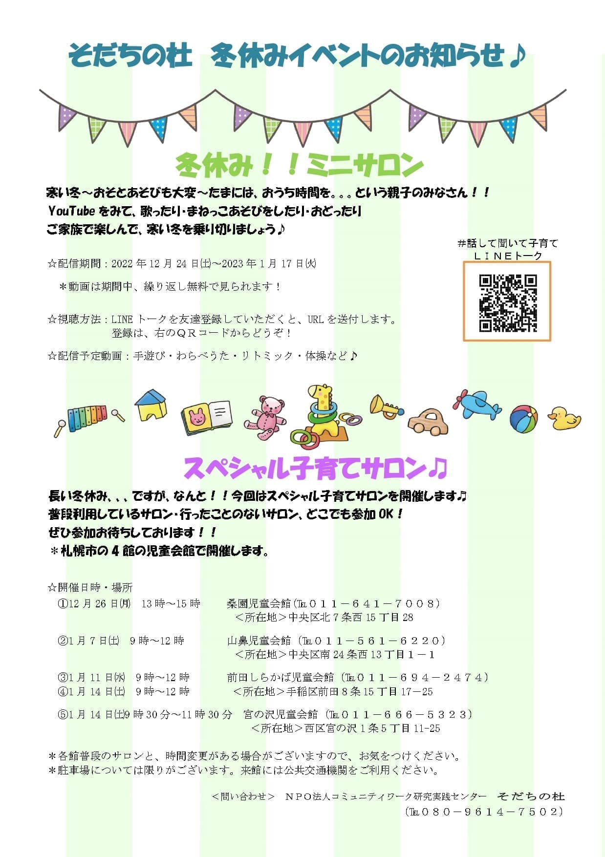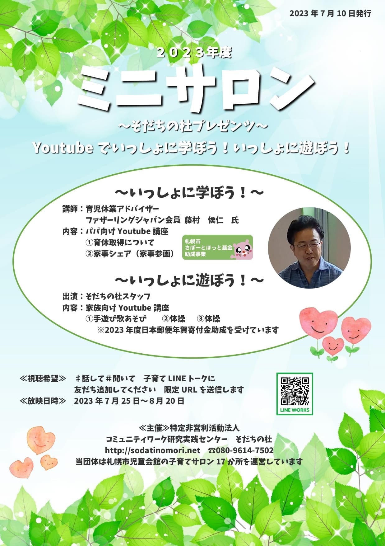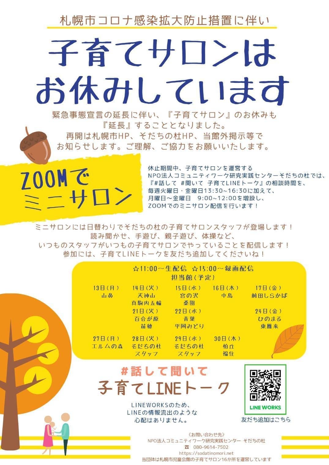 また「子育てLINEトーク」登録者の方対象に、zoomによる「ミニサロン」配信を行います。日程はチラシをご確認ください。