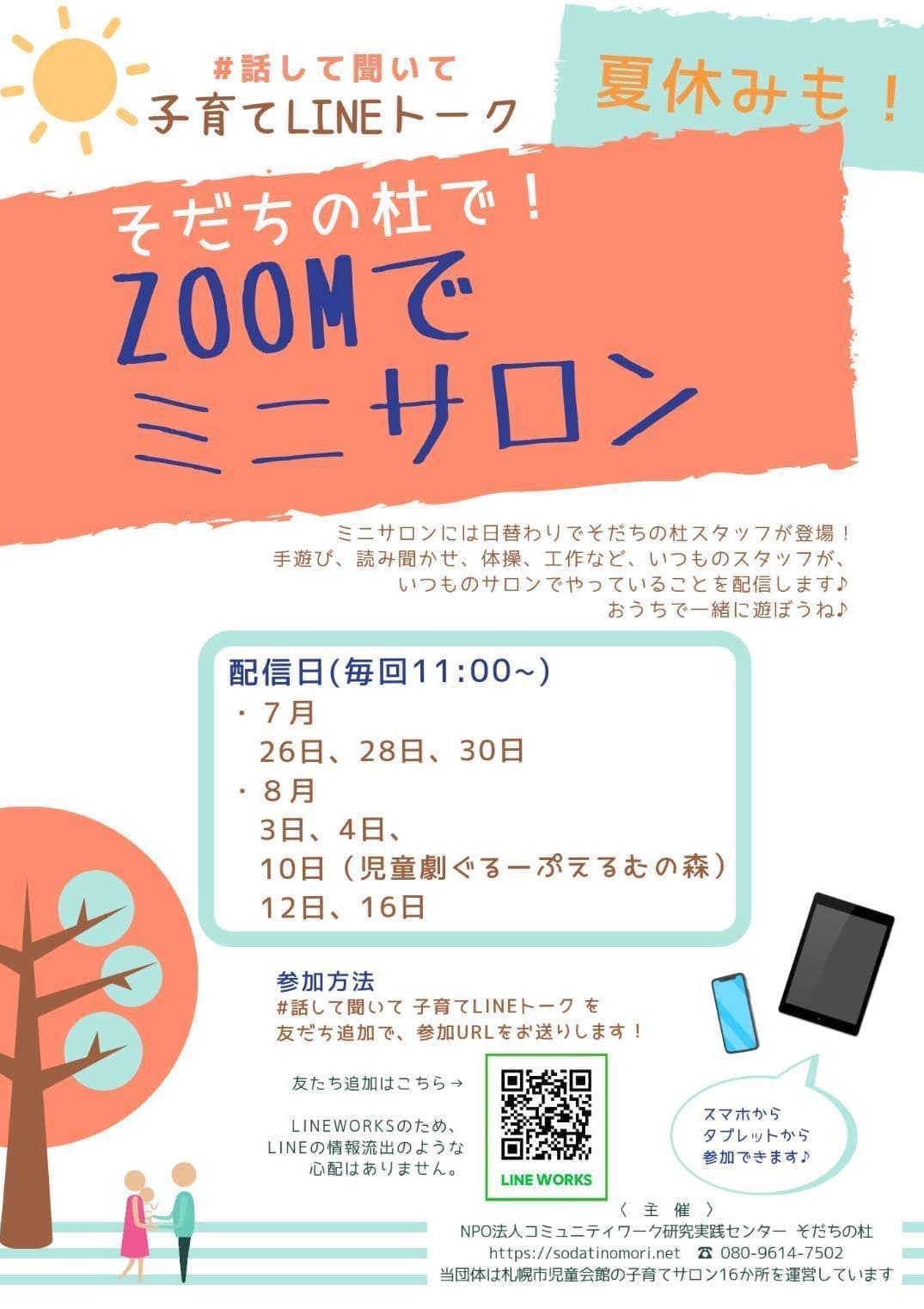 「子育てLINEトーク」登録者の方対象に、zoomによる「ミニサロン」配信を行います。日程はチラシをご確認ください。